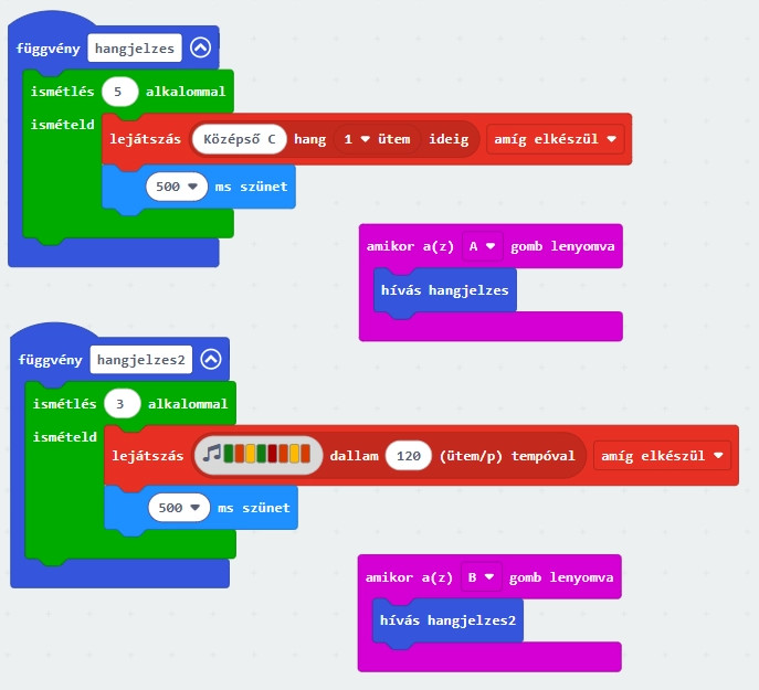 A hangjelzés2 nevű függvény egy dallamot játszik le, amit háromszor ismétel meg 500 ms várokozási időt tartva az ismétlések között. A B gomb megnyomásával hívjuk meg ezt a függvényt.