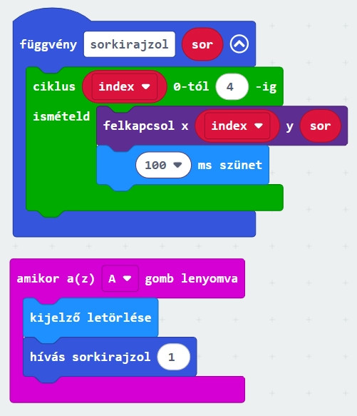 Írj egy függvényt, amely egy sor számát (0–4) kapja meg, és abban a sorban balról jobbra felkapcsolja a LED-eket!
