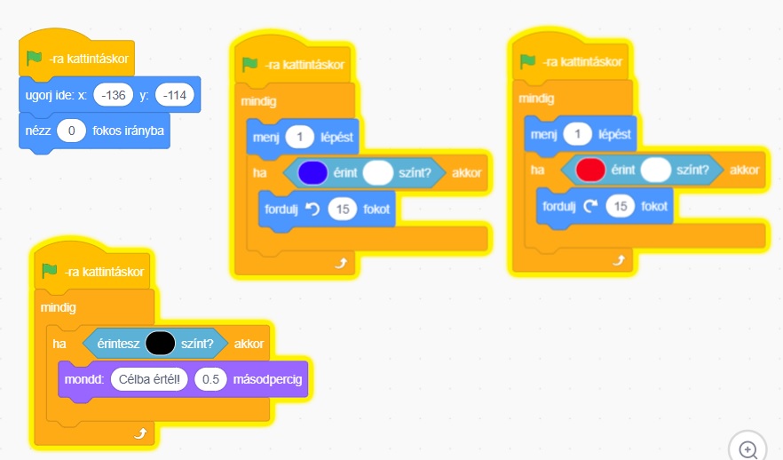 Készíts olyan programot, amelyben ha egy robot a kék színt érzékeli, akkor jobbra fordulva folytatja az útját, ha pedig sárgát, akkor balra fordul. Piros szín esetén forduljon vissza!