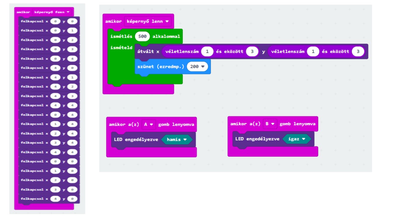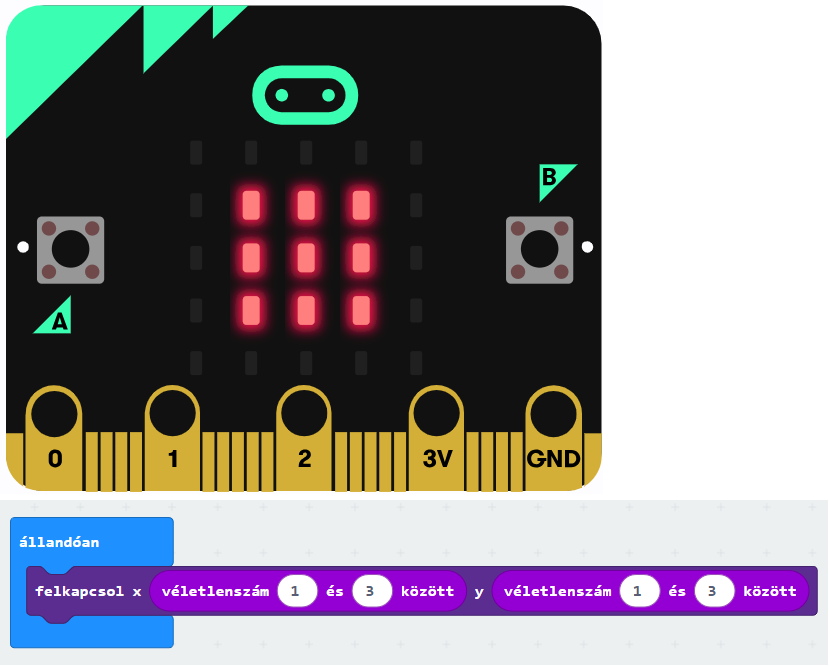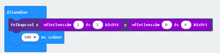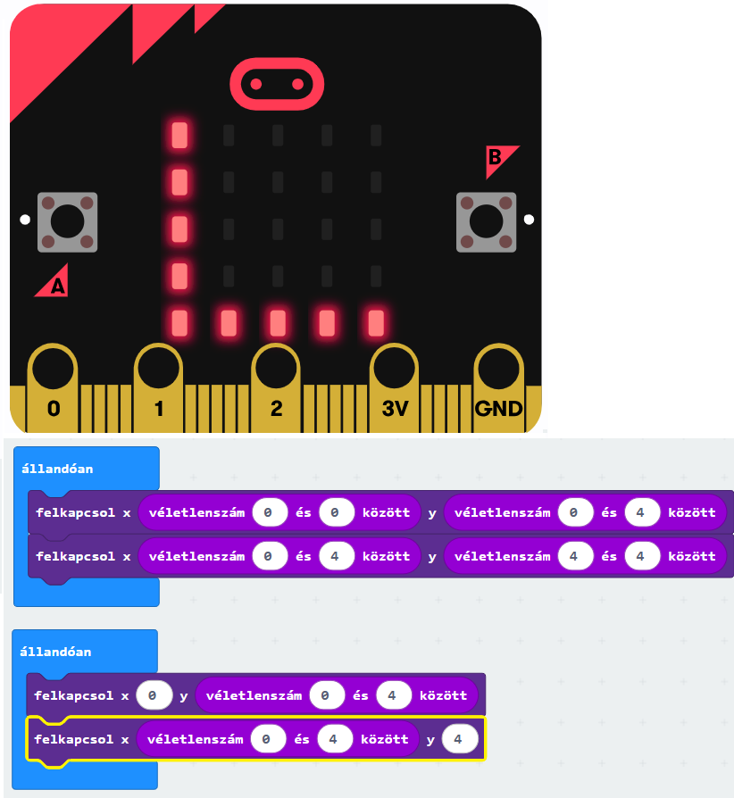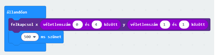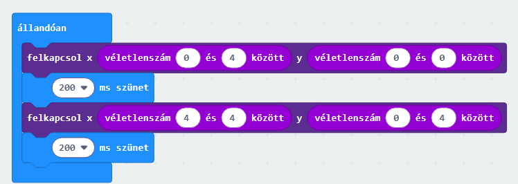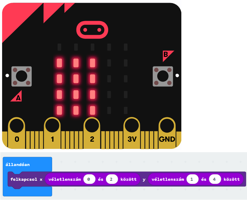 0 és 2 közötti X értékű ledek és 1 és 4 közötti Y értékű ledek véletlenszerű felkapcsolását valósítsd meg az Állandóan blokkban!