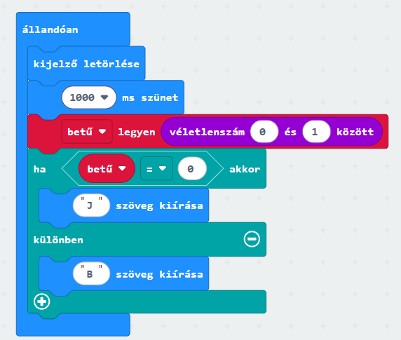 A program indításakor írjon ki a micro:bit egy J vagy B betűt. (Ha J betűt ír ki, akkor a játék során a jobb kezünket kell majd feltennünk, ha B betűt, akkor pedig a bal kezünket.) 1 másodperc múlva a folyamat automatikusan kezdődjön elölről! (Ne felejtsük el a képernyőt törölni!)