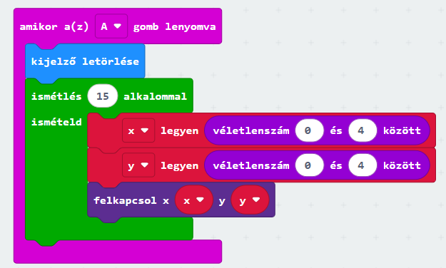 A parkolóhelyek 5 sorban és 5 oszlopban vannak elrendezve. Az A gomb hatására 15-ször válassszon a program véletlenszerű koordinátát, és kapcsolja fel az ezekhez tartozó LED-eket!