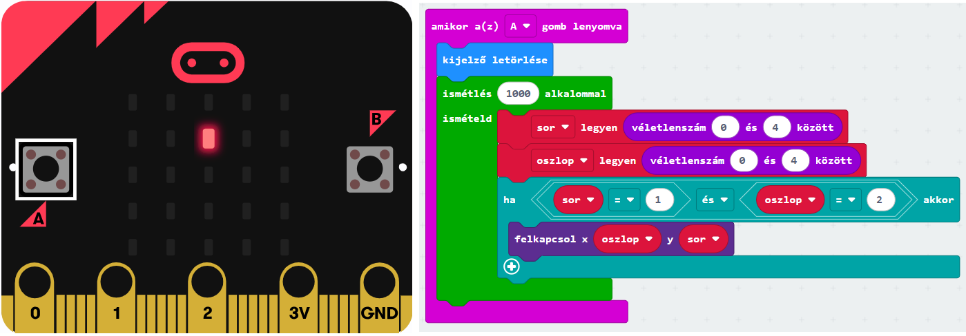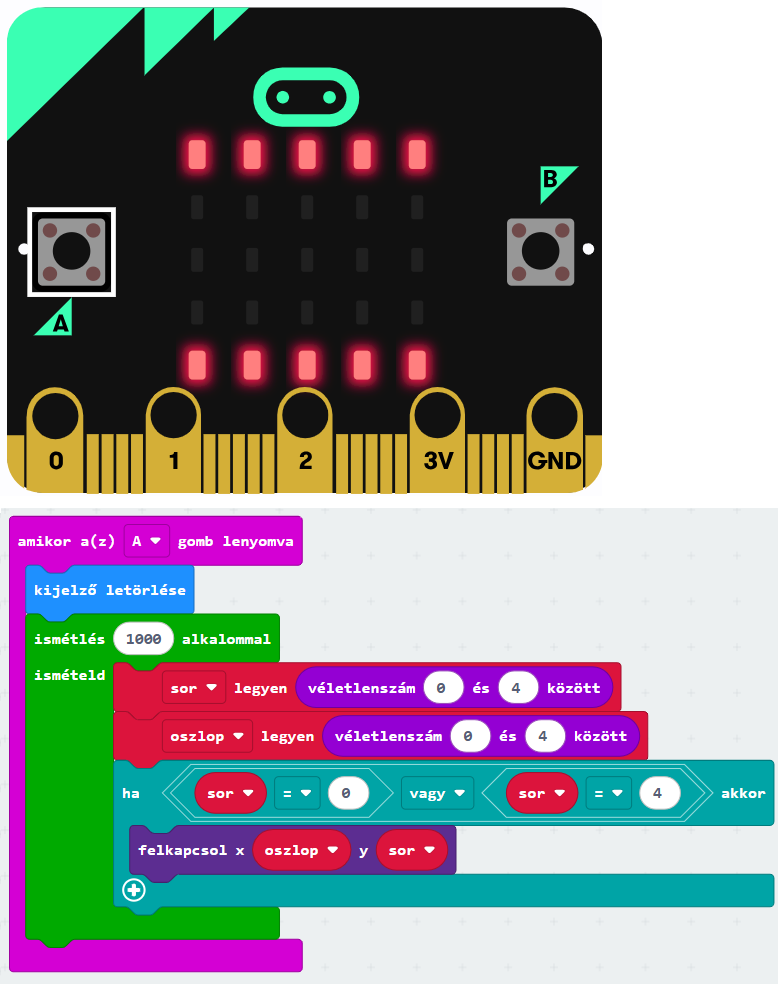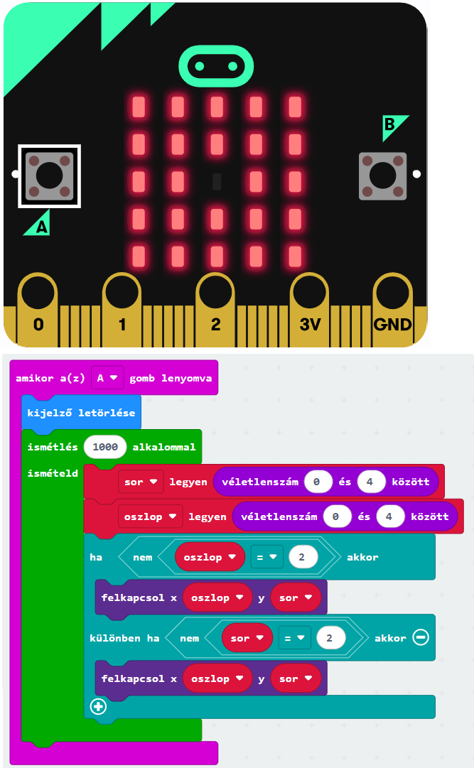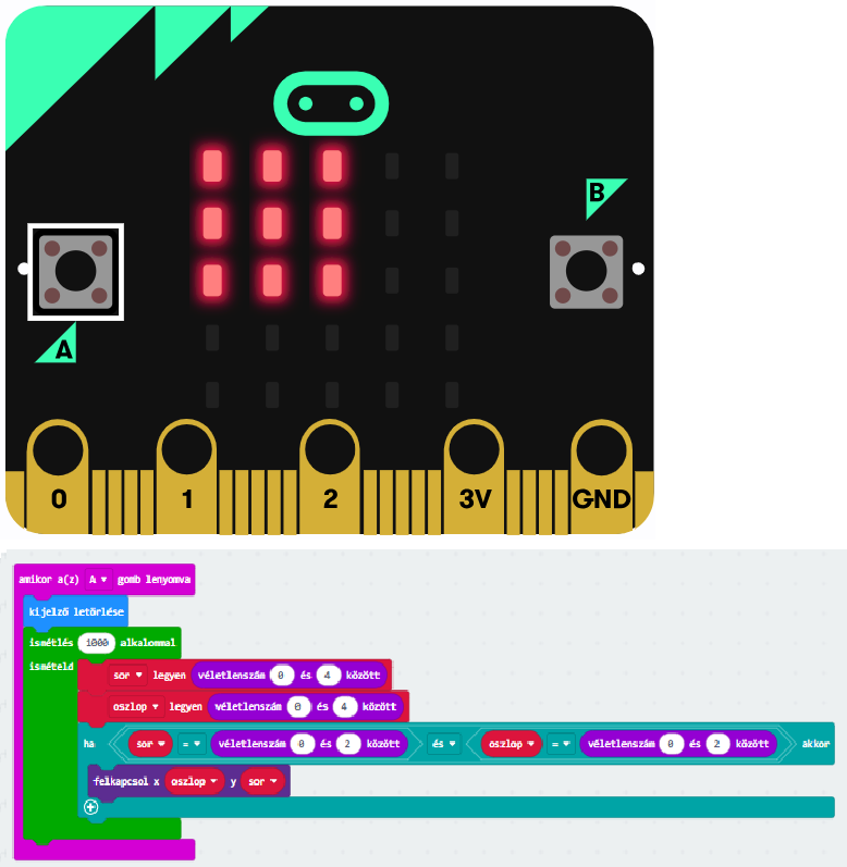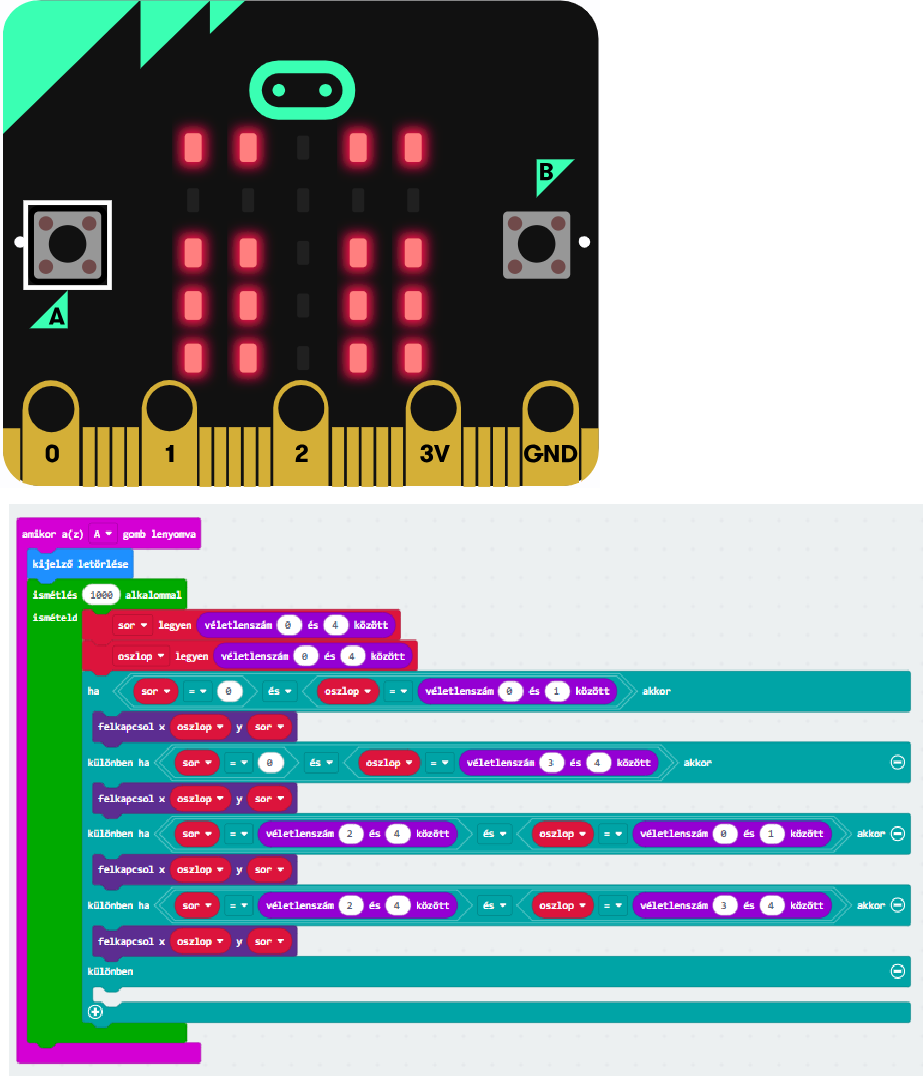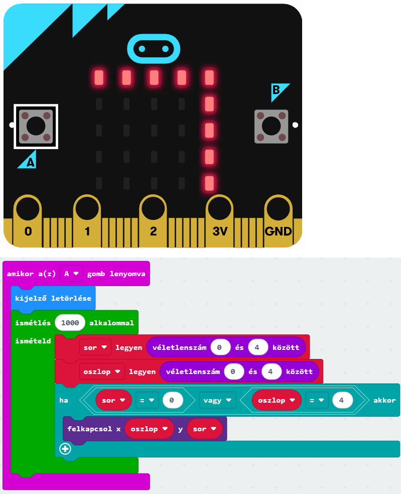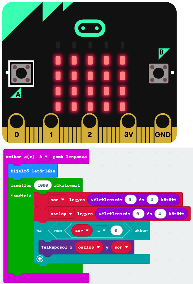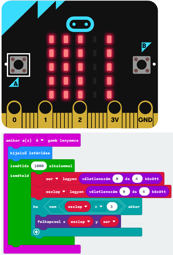 Az A gomb megnyomásakor törlődjön a kijelző! Ezt követően ezer alkalommal válasszunk véletlenszerűen sor- és oszlopkoordinátát nulla és négy között, majd kapcsoljuk fel az ezen a koordinátán lévő LED-et!