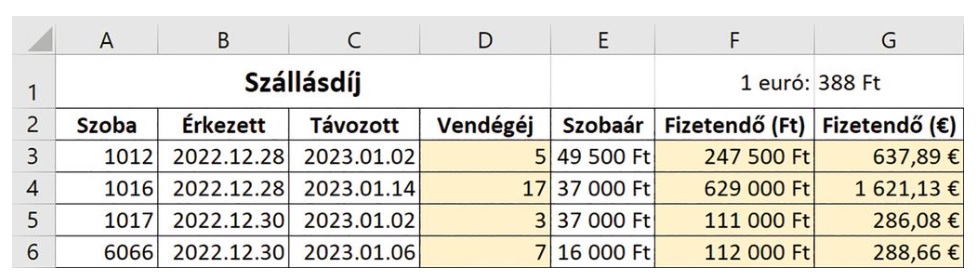 - Néhány külföldi szívesebben fizet euróban. Írjuk be a G1-es cellába az euró árfolyamát, és fejezzük ki a G oszlopban a fizetendő összeget euróban! (A napi euró/Ft árfolyamot például a Nemzeti Bank honlapján nézhetjük meg.)