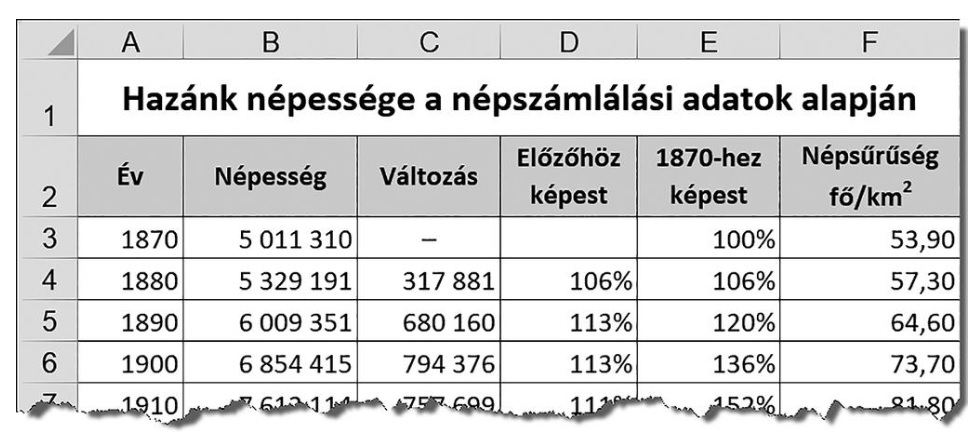 - Az A oszlop a népszámlálás évét, a B oszlop a népességet tartalmazza az adott évben. Határozzuk meg képlet segítségével