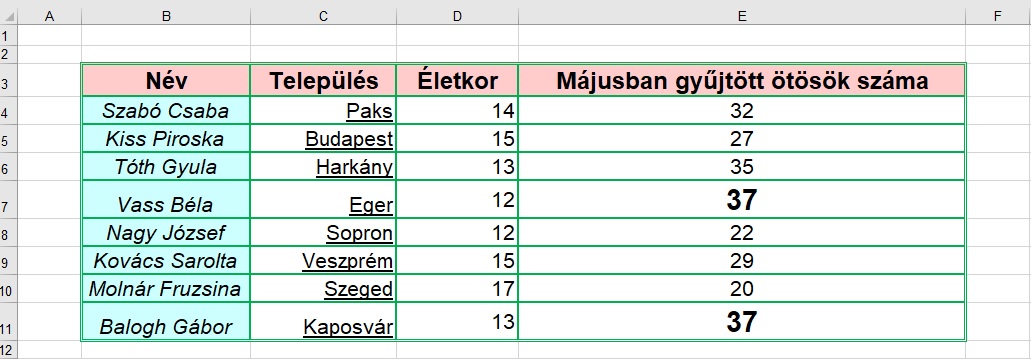 - Formázzuk meg a táblázatot a mintának megfelelően, és szemléltessük az adatokat megfelelően választott diagramon!