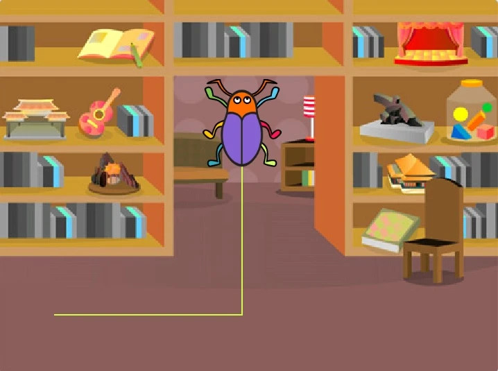 Szereplők megnézegetése: bogár (Beetle) kiválasztása.Macska szereplő törlése.Játék indulásakor a bogár a bal alsó sarokban legyen a könyvespolc előtt, jobbra nézzen.A szóköz gomb lenyomásával jutassuk el a bogarat a térelválasztó polcon át a szoba belső részébe. (Menj és fordulj parancsok használata. Kisérletezgess, próbálgasd, melyik értékkel hova jutsz)