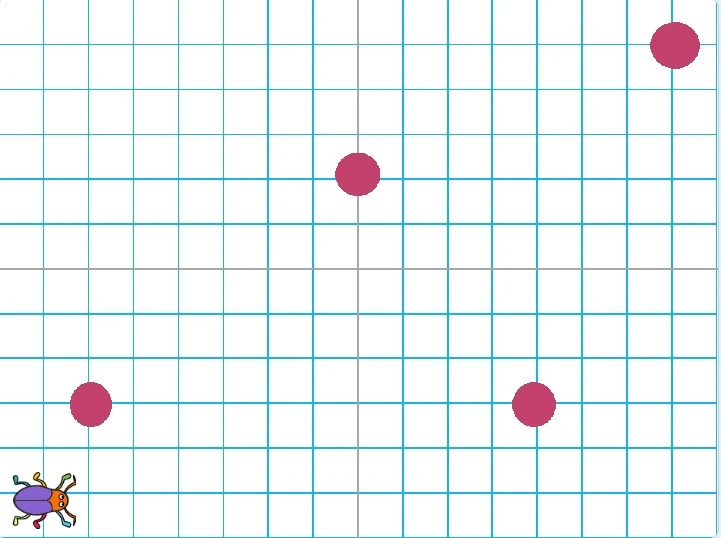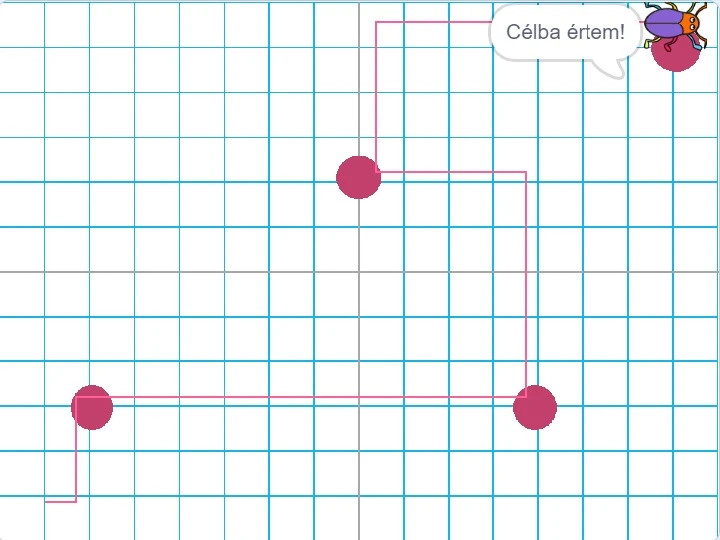 Hátterek közül válaszd ki a Yy-grid-30px nevűt! Szereplők közül Beetle bogarat.Macska szereplő törlése.A háttéren helyezz el 4 darab bordó színű kört! Egyetlen kikötés, hogy az utolsó kör a jobb felső sarokban legyen, ez lesz a cél.Játék indulásakor a bogár a bal alsó sarokban legyen, jobbra nézzen.