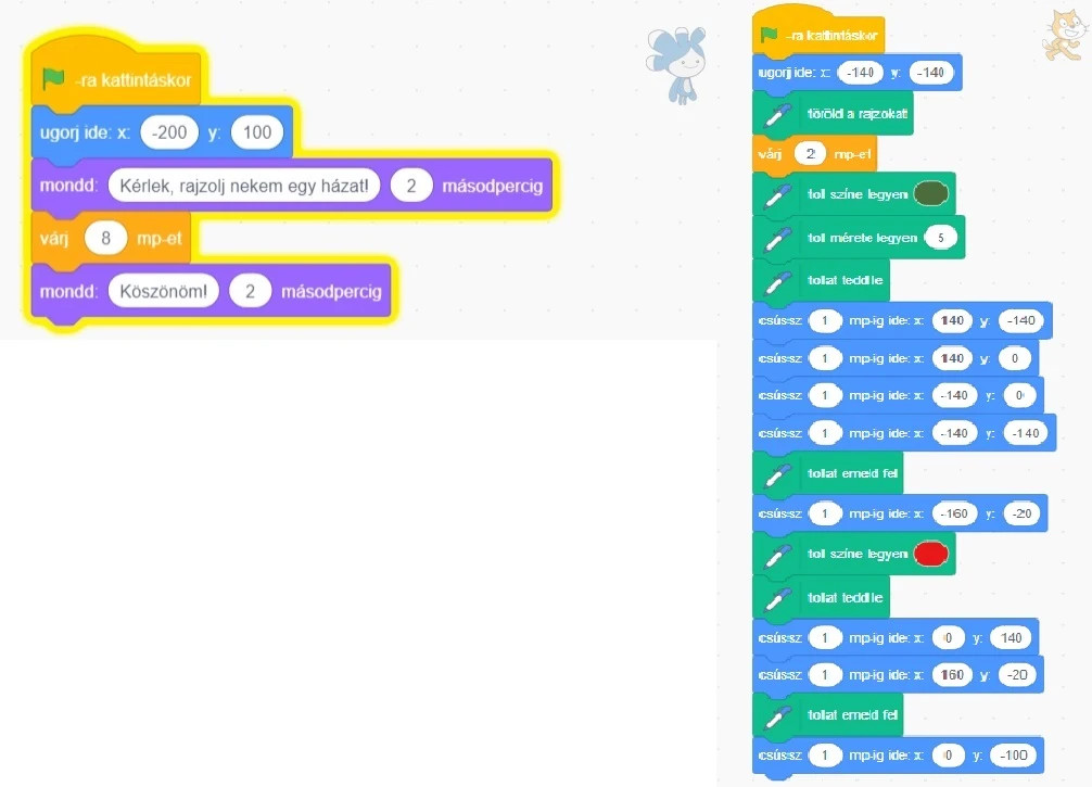 A hátterek közül válaszd az XY-Grid nevűt!A szereplők közül válaszd ki Terát! A macska szereplőnk is maradjon meg, ő fog rajzolni.Tera kéri meg a macskát, hogy rajzoljon neki egy házat, majd megköszöni.