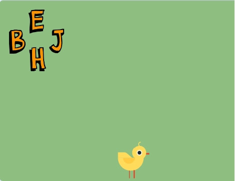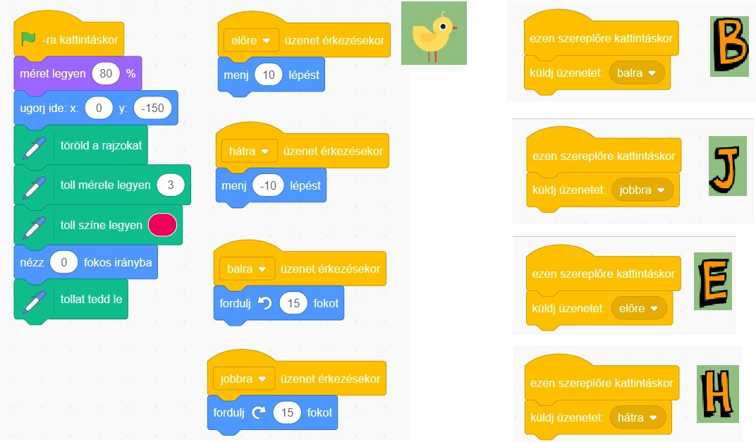 - Szereplők: teknős, E betű, H betű, J betű, B betű.