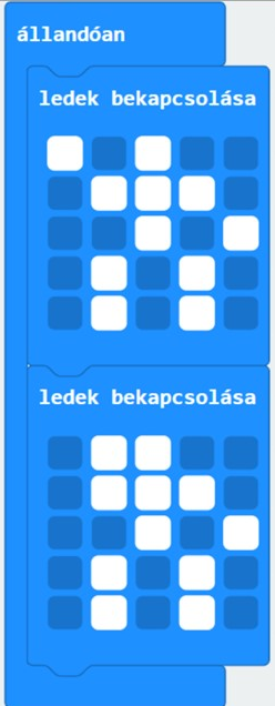 A ledmátrix felett a Micro:bit logója látható, amely olyan, mintha egy robot feje lenne. Így csak a robot testét kell megrajzolni. Készítsünk olyan animációt, amelyben a robot folyamatosan integet a jobb kezével.