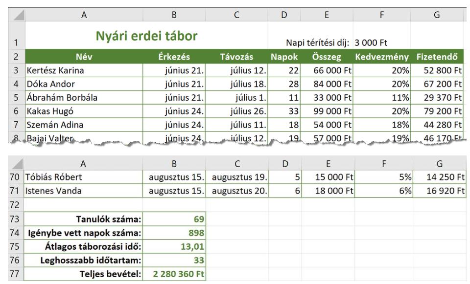 - Adjuk meg a kedvezményes térítési díjat a G oszlopban!